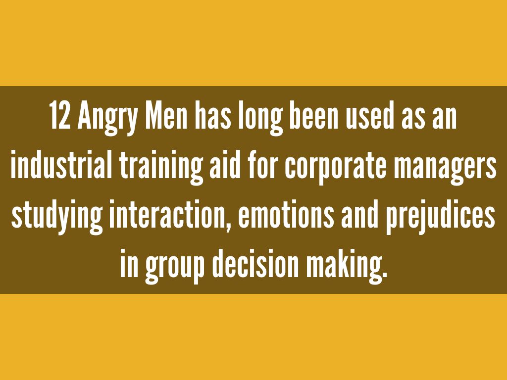 12 Angry Men has long been used as an industrial training aid for corporate managers studying interaction, emotions and prejudices in group decision making.