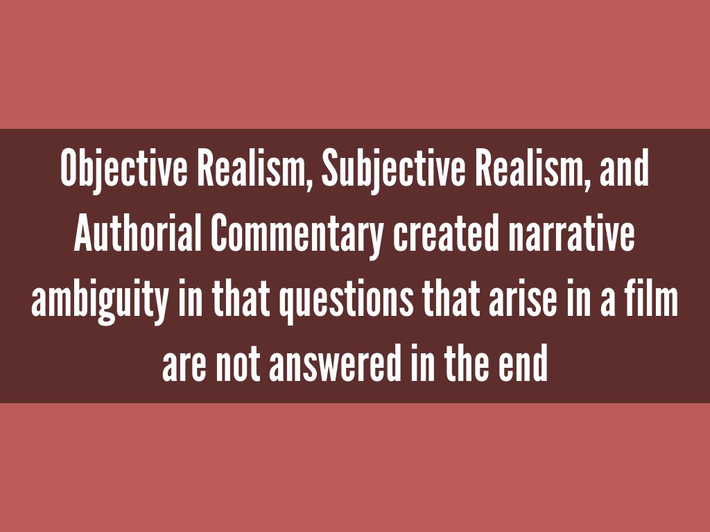 Objective Realism, Subjective Realism, and Authorial Commentary created narrative ambiguity in that questions that arise in a film are not answered in the end