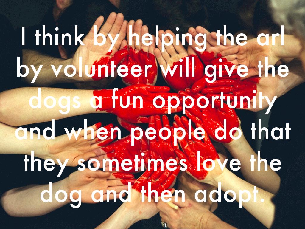 I have decided that I want to help the animals there because it’s unfair that they don’t get a home or to be loved and that some of them get laid down for no reason.so I think it’s helpful to see them