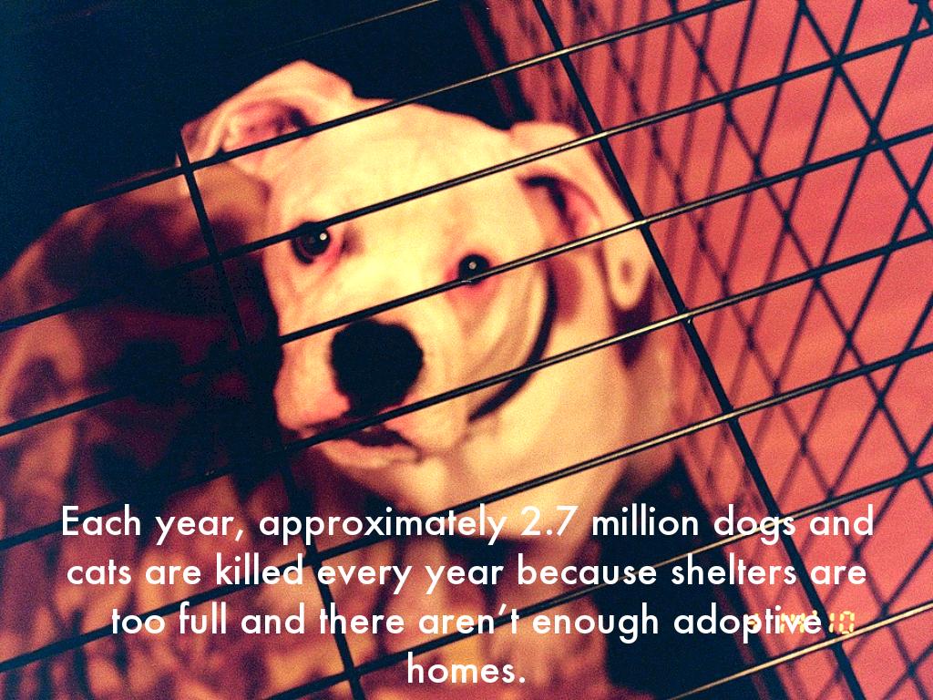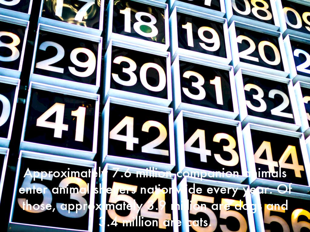 Approximately 7.6 million companion animals enter animal shelters nationwide every year. Of those, approximately 3.9 million are dogs and 3.4 million are cats.