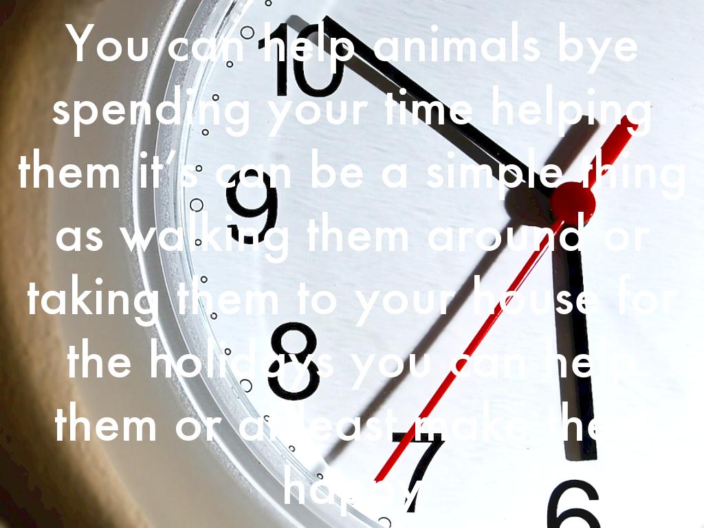 You can help animals bye spending your time helping them it’s can be a simple thing as walking them around or taking them to your house for the holidays you can help them or at least make them happy