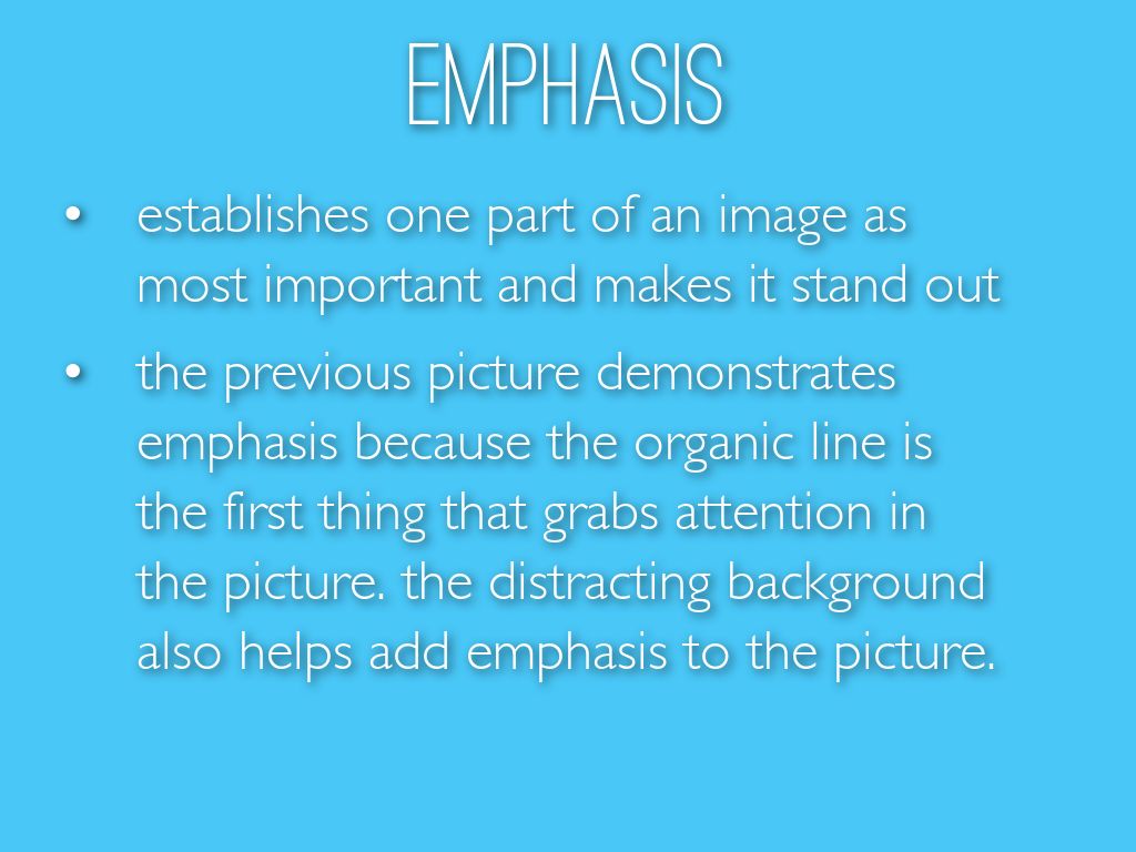 the previous picture demonstrates emphasis because the organic line is the first thing that grabs attention in the picture. the distracting background also helps add emphasis to the picture.