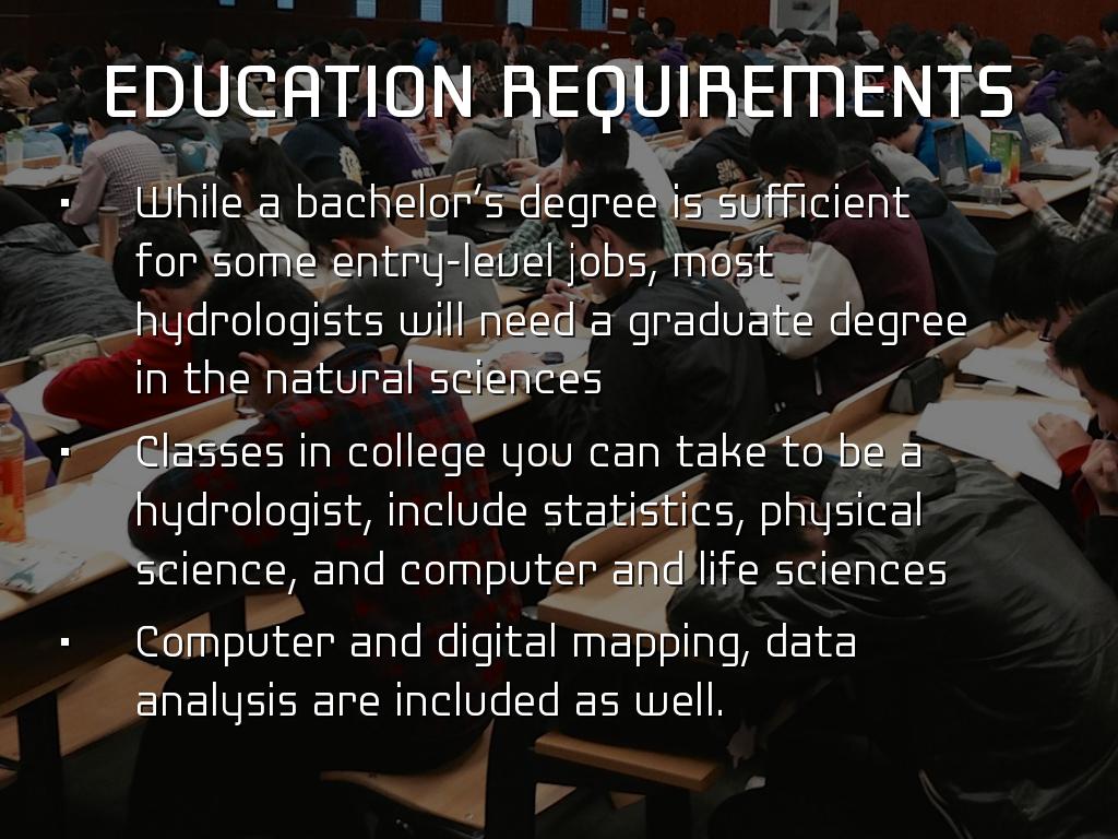 While a bachelor’s degree is sufficient for some entry-level jobs, most hydrologists will need a graduate degree in the natural sciences