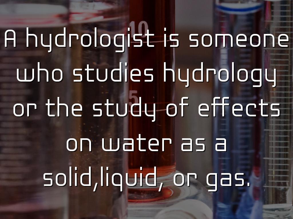 A hydrologist is someone who studies hydrology or the study of effects on water as a solid,liquid, or gas.
