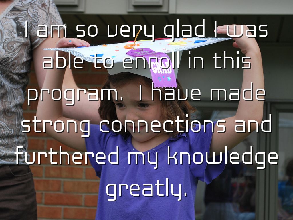 I am so very glad I was able to enroll in this program. I have made strong connections and furthered my knowledge greatly.