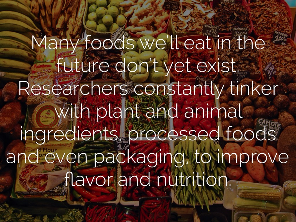 Many foods we’ll eat in the future don’t yet exist. Researchers constantly tinker with plant and animal ingredients, processed foods and even packaging, to improve flavor and nutrition.