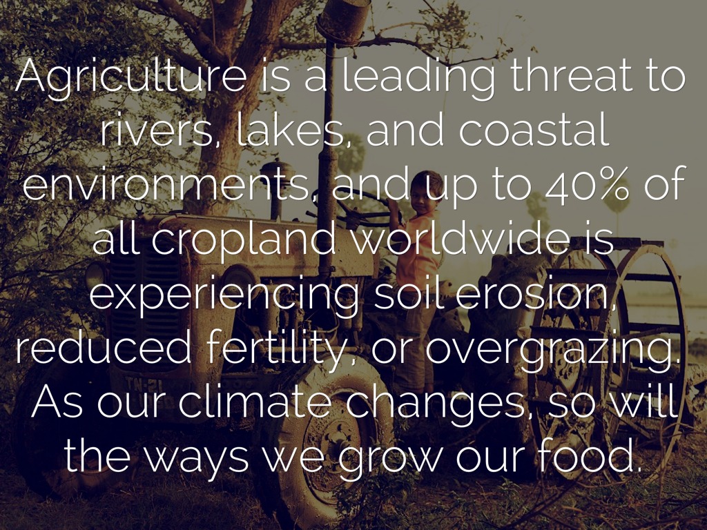 Agriculture is a leading threat to rivers, lakes, and coastal environments, and up to 40% of all cropland worldwide is experiencing soil erosion, reduced fertility, or overgrazing. As our climate changes, so will the ways we grow our food.