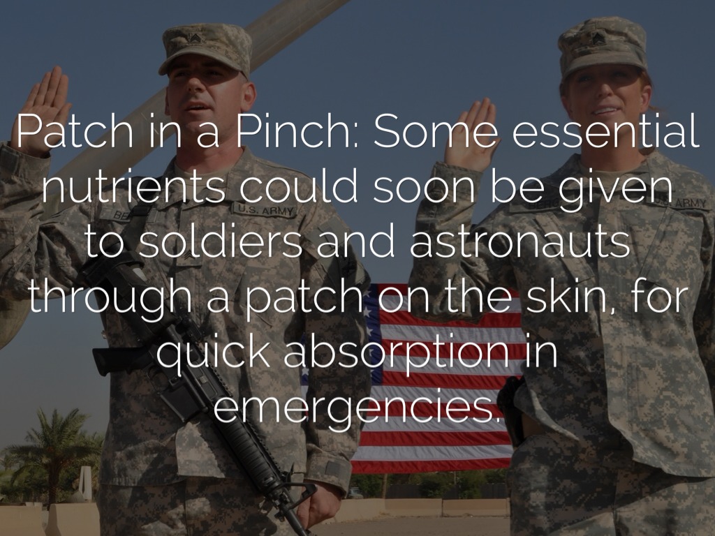 Patch in a Pinch: Some essential nutrients could soon be given to soldiers and astronauts through a patch on the skin, for quick absorption in emergencies.