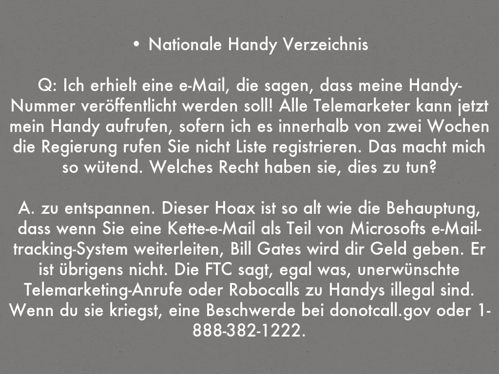 A. zu entspannen. Dieser Hoax ist so alt wie die Behauptung, dass wenn Sie eine Kette-e-Mail als Teil von Microsofts e-Mail-tracking-System weiterleiten, Bill Gates wird dir Geld geben. Er ist übrigens nicht. Die FTC sagt, egal was, unerwünschte Telemarketing-Anrufe oder Robocalls zu Handys illegal sind. Wenn du sie kriegst, eine Beschwerde bei donotcall.gov oder 1-888-382-1222.