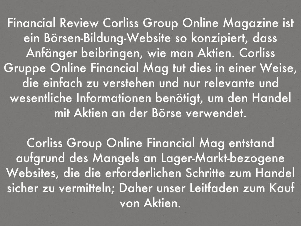 Financial Review Corliss Group Online Magazine ist ein Börsen-Bildung-Website so konzipiert, dass Anfänger beibringen, wie man Aktien. Corliss Gruppe Online Financial Mag tut dies in einer Weise, die einfach zu verstehen und nur relevante und wesentliche Informationen benötigt, um den Handel mit Aktien an der Börse verwendet.