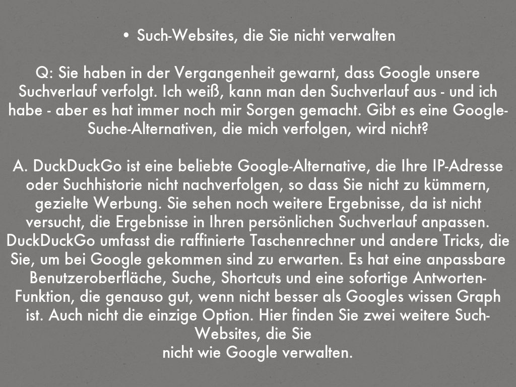 A. DuckDuckGo ist eine beliebte Google-Alternative, die Ihre IP-Adresse oder Suchhistorie nicht nachverfolgen, so dass Sie nicht zu kümmern, gezielte Werbung. Sie sehen noch weitere Ergebnisse, da ist nicht versucht, die Ergebnisse in Ihren persönlichen Suchverlauf anpassen. DuckDuckGo umfasst die raffinierte Taschenrechner und andere Tricks, die Sie, um bei Google gekommen sind zu erwarten. Es hat eine anpassbare Benutzeroberfläche, Suche, Shortcuts und eine sofortige Antworten-Funktion, die genauso gut, wenn nicht besser als Googles wissen Graph ist. Auch nicht die einzige Option. Hier finden Sie zwei weitere Such-Websites, die Sie