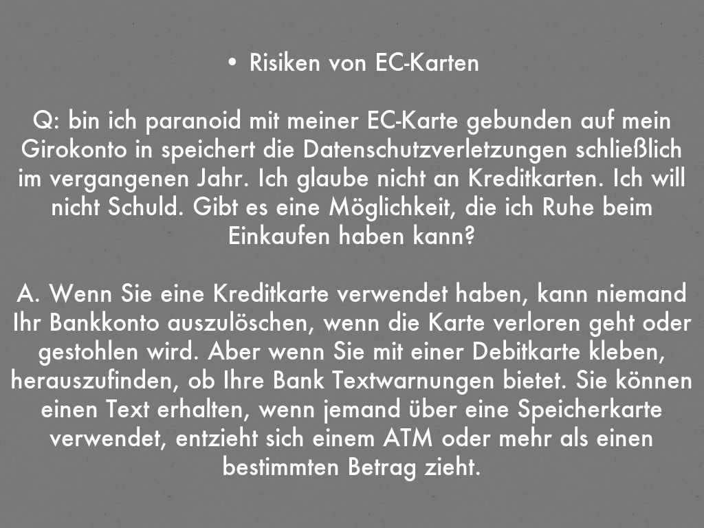 Q: bin ich paranoid mit meiner EC-Karte gebunden auf mein Girokonto in speichert die Datenschutzverletzungen schließlich im vergangenen Jahr. Ich glaube nicht an Kreditkarten. Ich will nicht Schuld. Gibt es eine Möglichkeit, die ich Ruhe beim Einkaufen haben kann?