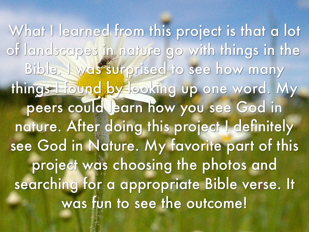 What I learned from this project is that a lot of landscapes in nature go with things in the Bible. I was surprised to see how many things I found by looking up one word. My peers could learn how you see God in nature. After doing this project I definitely see God in Nature. My favorite part of this project was choosing the photos and searching for a appropriate Bible verse. It was fun to see the outcome!