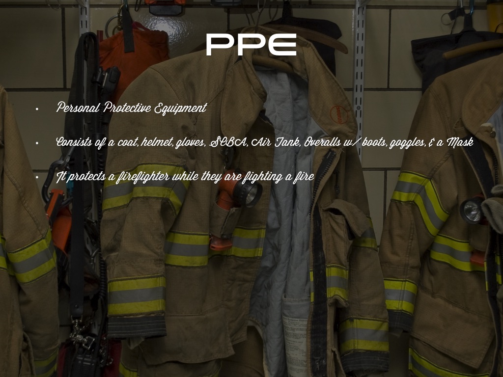 • Consists of a coat, helmet, gloves, SCBA, Air Tank, Overalls w/ boots, goggles, & a Mask