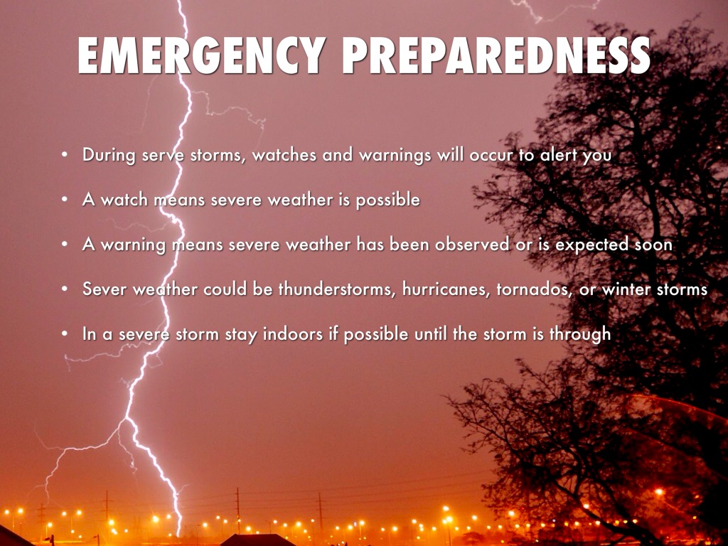 Sever weather could be thunderstorms, hurricanes, tornados, or winter storms