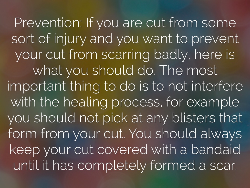 Prevention: If you are cut from some sort of injury and you want to prevent your cut from scarring badly, here is what you should do. The most important thing to do is to not interfere with the healing process, for example you should not pick at any blisters that form from your cut. You should always keep your cut covered with a bandaid until it has completely formed a scar.
