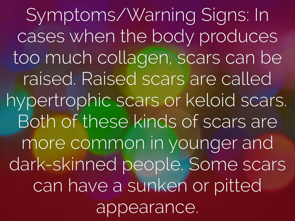 Symptoms/Warning Signs: In cases when the body produces too much collagen, scars can be raised. Raised scars are called hypertrophic scars or keloid scars. Both of these kinds of scars are more common in younger and dark-skinned people. Some scars can have a sunken or pitted appearance.