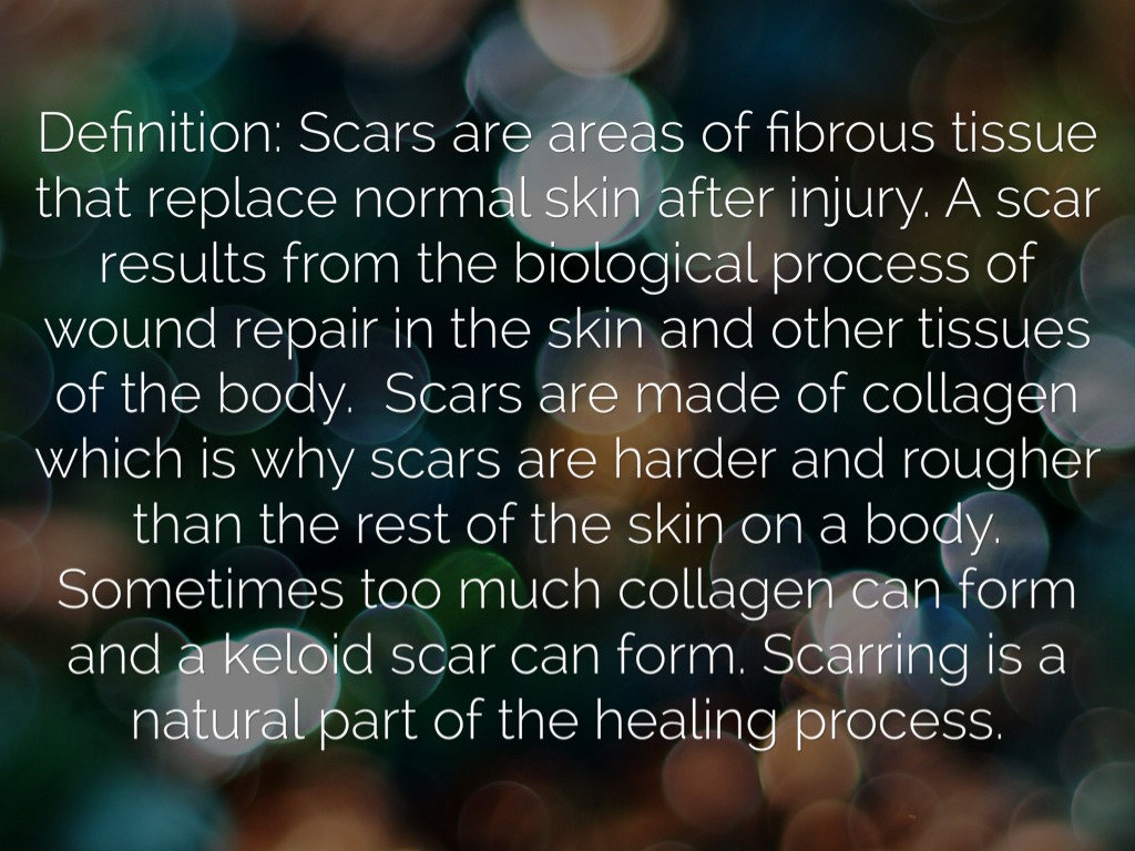 Definition: Scars are areas of fibrous tissue that replace normal skin after injury. A scar results from the biological process of wound repair in the skin and other tissues of the body. Scars are made of collagen which is why scars are harder and rougher than the rest of the skin on a body. Sometimes too much collagen can form and a keloid scar can form. Scarring is a natural part of the healing process.