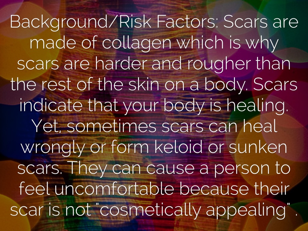 Background/Risk Factors: Scars are made of collagen which is why scars are harder and rougher than the rest of the skin on a body. Scars indicate that your body is healing. Yet, sometimes scars can heal wrongly or form keloid or sunken scars. They can cause a person to feel uncomfortable because their scar is not "cosmetically appealing" .
