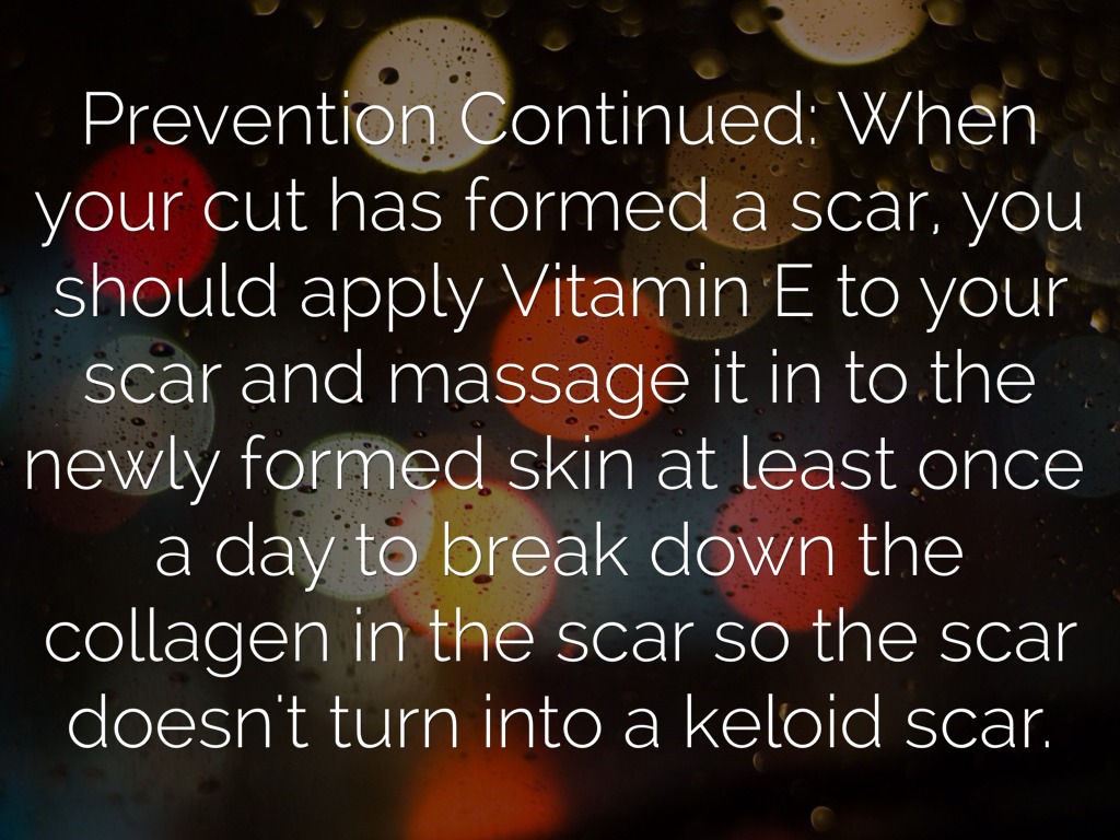 Prevention Continued: When your cut has formed a scar, you should apply Vitamin E to your scar and massage it in to the newly formed skin at least once a day to break down the collagen in the scar so the scar doesn't turn into a keloid scar.