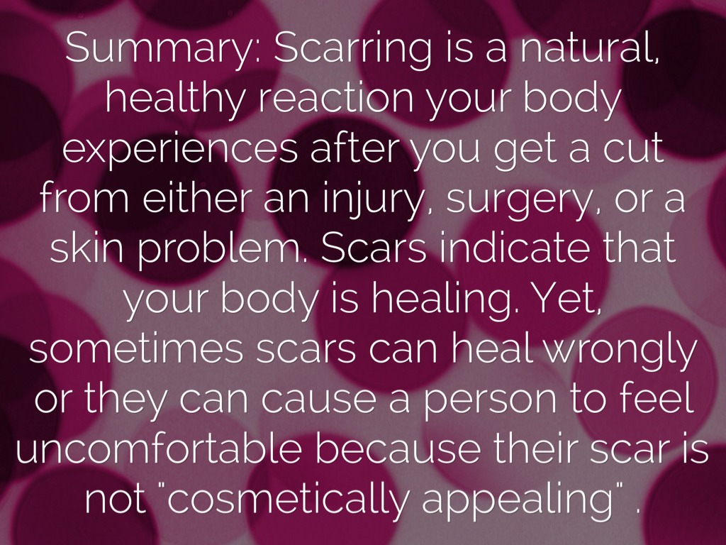 Summary: Scarring is a natural, healthy reaction your body experiences after you get a cut from either an injury, surgery, or a skin problem. Scars indicate that your body is healing. Yet, sometimes scars can heal wrongly or they can cause a person to feel uncomfortable because their scar is not "cosmetically appealing" .