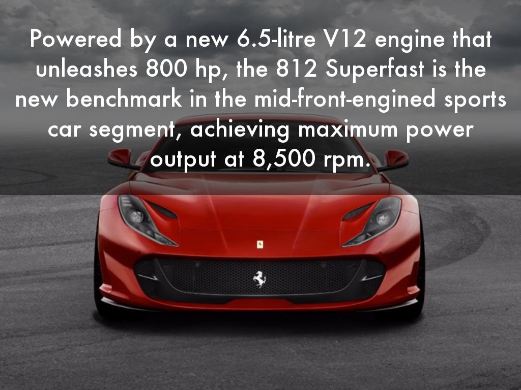 Powered by a new 6.5-litre V12 engine that unleashes 800 hp, the 812 Superfast is the new benchmark in the mid-front-engined sports car segment, achieving maximum power output at 8,500 rpm.