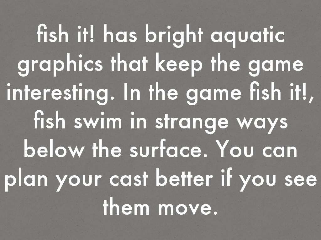 fish it! has bright aquatic graphics that keep the game interesting. In the game fish it!, fish swim in strange ways below the surface. You can plan your cast better if you see them move.