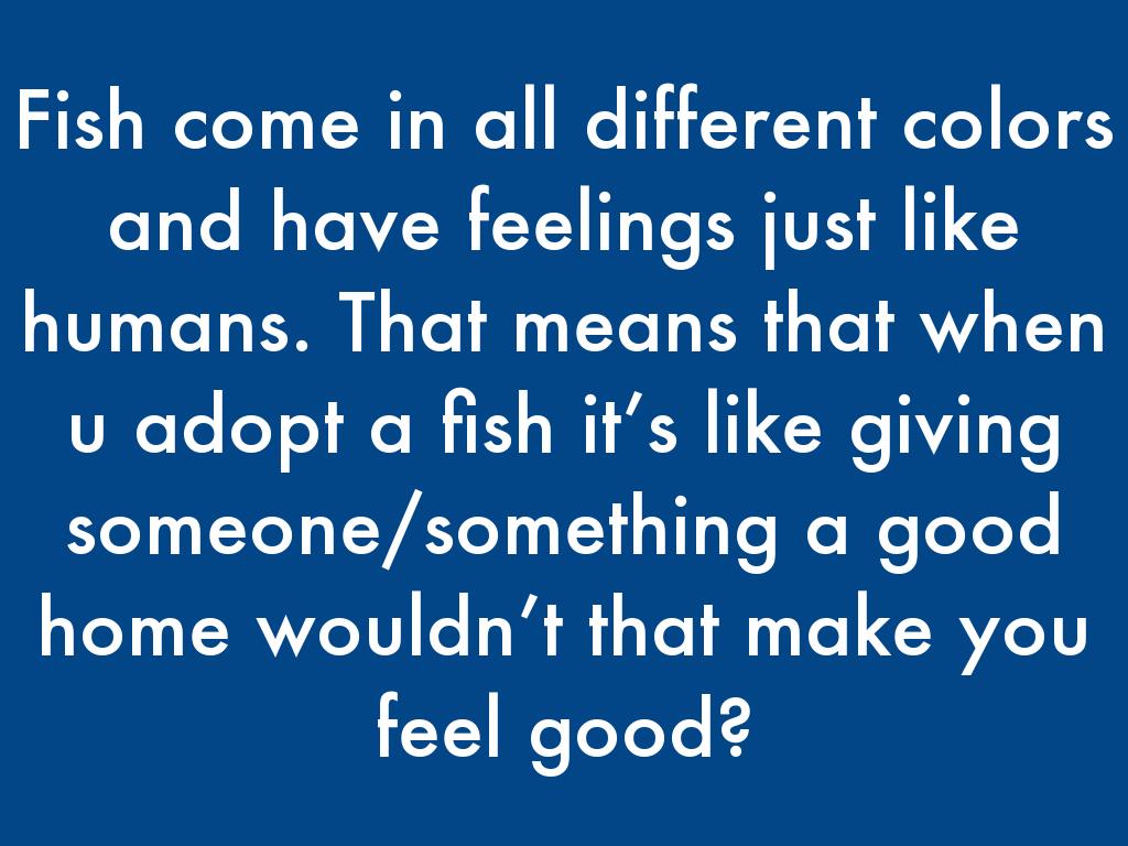 Fish come in all different colors and have feelings just like humans. That means that when u adopt a fish it’s like giving someone/something a good home wouldn’t that make you feel good?