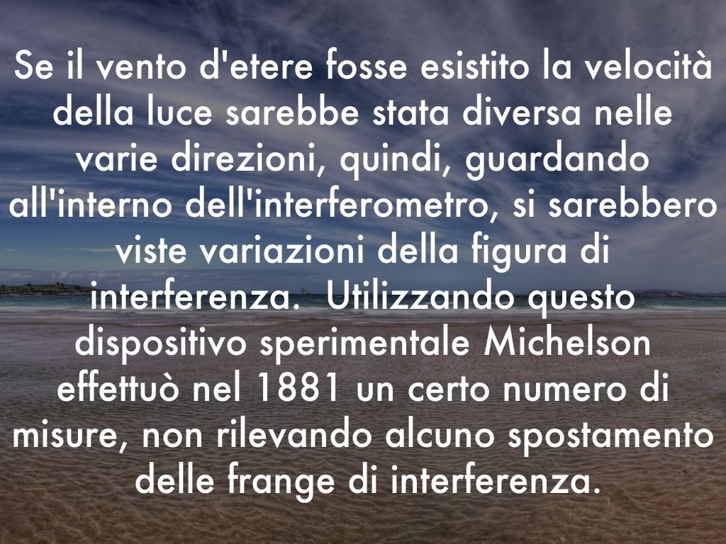 Se il vento d'etere fosse esistito la velocità della luce sarebbe stata diversa nelle varie direzioni, quindi, guardando all'interno dell'interferometro, si sarebbero viste variazioni della figura di interferenza. Utilizzando questo dispositivo sperimentale Michelson effettuò nel 1881 un certo numero di misure, non rilevando alcuno spostamento delle frange di interferenza.