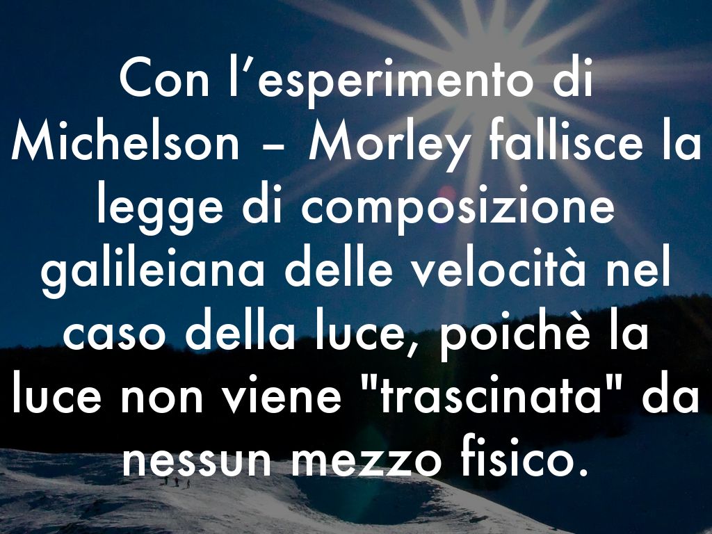 Con l’esperimento di Michelson – Morley fallisce la legge di composizione galileiana delle velocità nel caso della luce, poichè la luce non viene "trascinata" da nessun mezzo fisico.