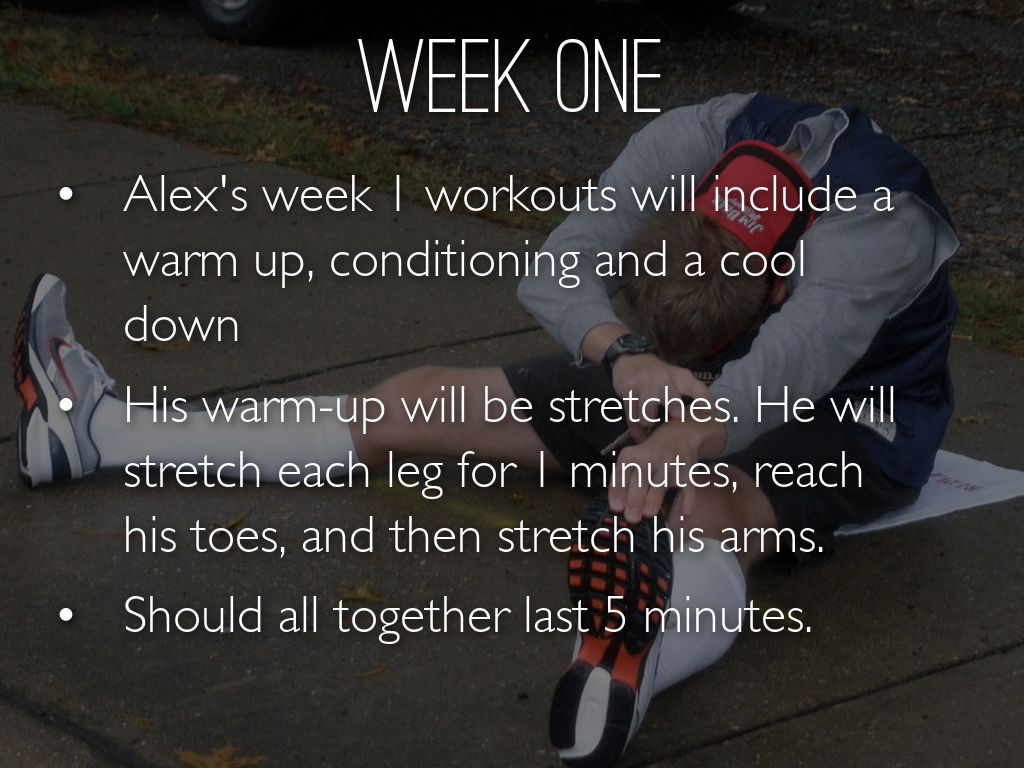 Alex's week 1 workouts will include a warm up, conditioning and a cool down