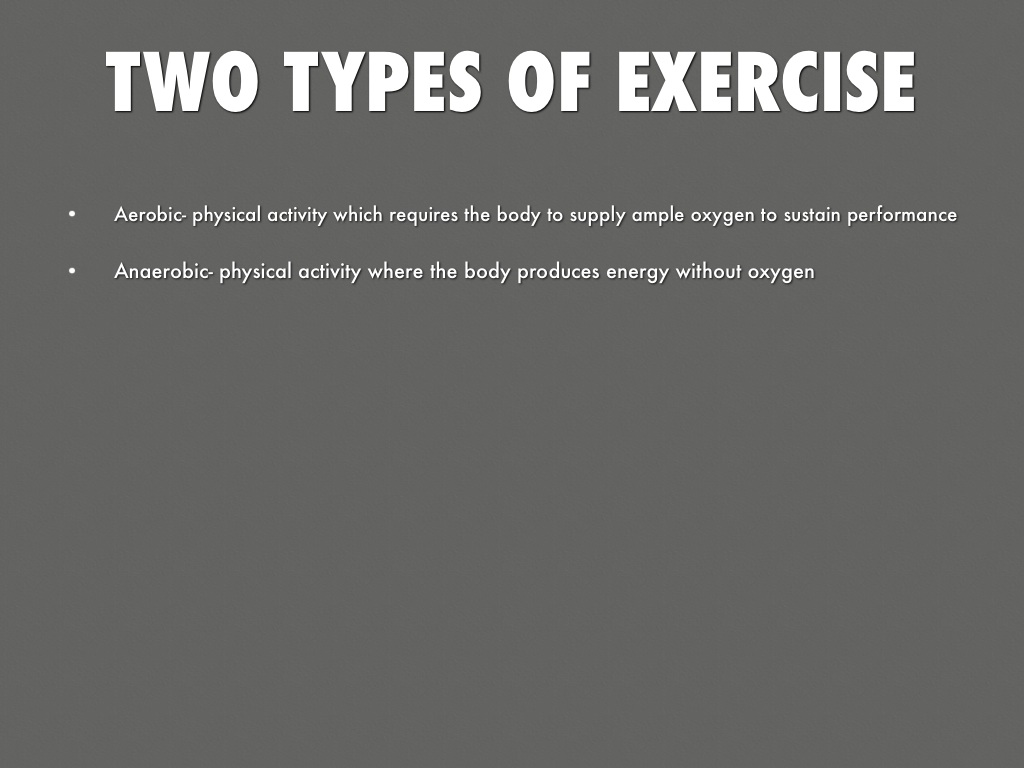 Aerobic- physical activity which requires the body to supply ample oxygen to sustain performance