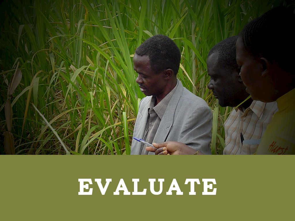 The last step in the Model is Evaluate the results and it judges the effectiveness of the students learning from the teaching authority. The selected graphic illustrates a type of surveying on a field of crop to assess its development of growth to a healthy product.