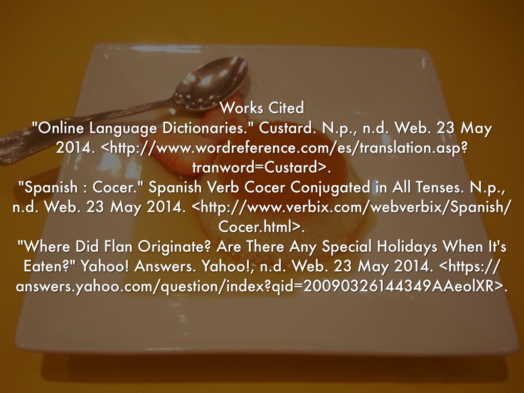 "Where Did Flan Originate? Are There Any Special Holidays When It's Eaten?" Yahoo! Answers. Yahoo!, n.d. Web. 23 May 2014. .