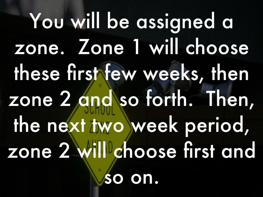 You will be assigned a zone. Zone 1 will choose these first few weeks, then zone 2 and so forth. Then, the next two week period, zone 2 will choose first and so on.