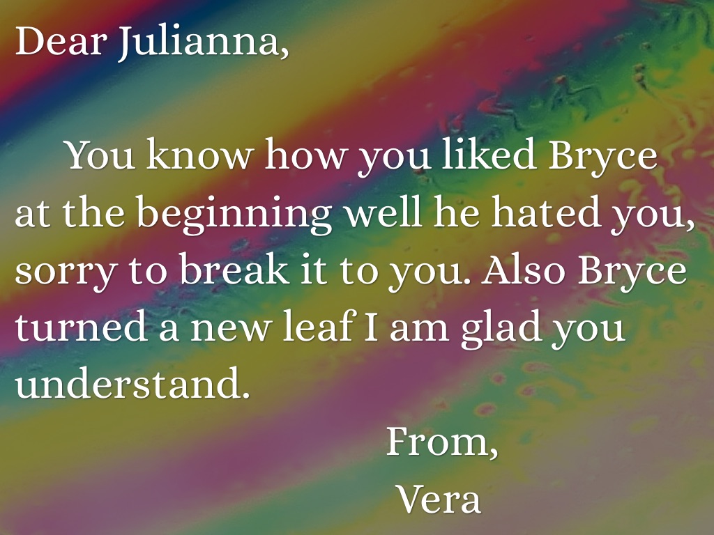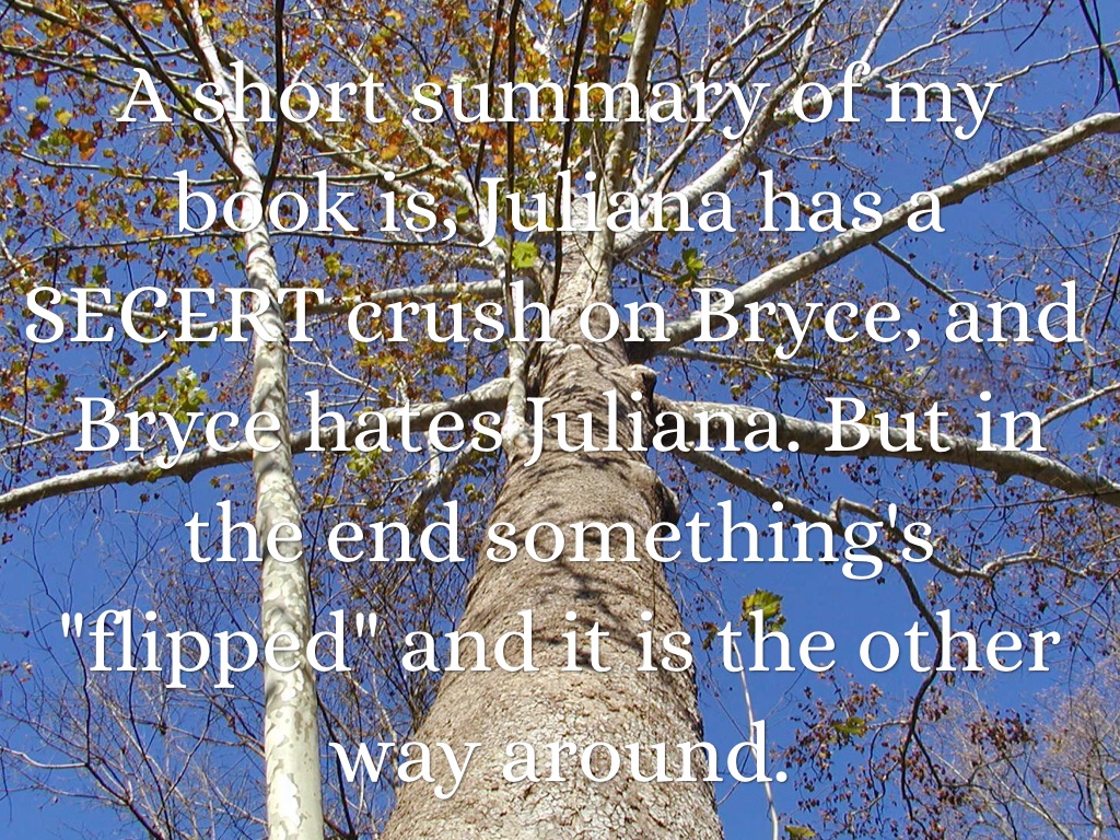 A short summary of my book is, Juliana has a SECERT crush on Bryce, and Bryce hates Juliana. But in the end something's "flipped" and it is the other way around.