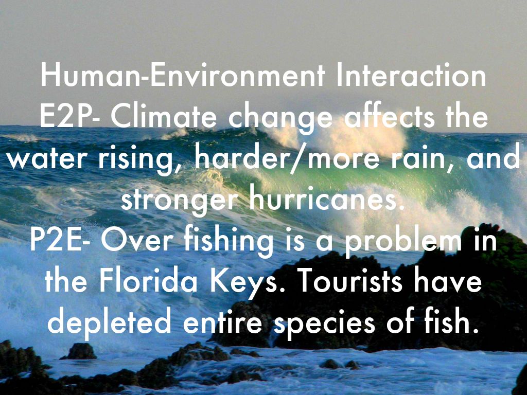 Human-Environment Interaction E2P- Climate change affects the water rising, harder/more rain, and stronger hurricanes. P2E- Over fishing is a problem in the Florida Keys. Tourists have depleted entire species of fish.