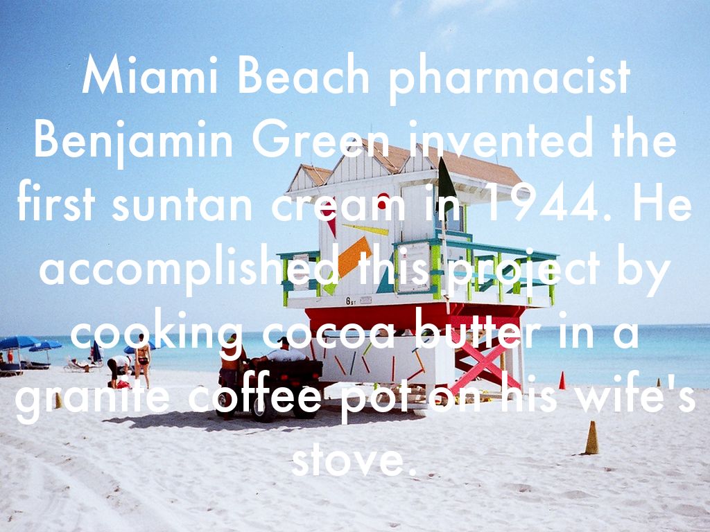 Miami Beach pharmacist Benjamin Green invented the first suntan cream in 1944. He accomplished this project by cooking cocoa butter in a granite coffee pot on his wife's stove.