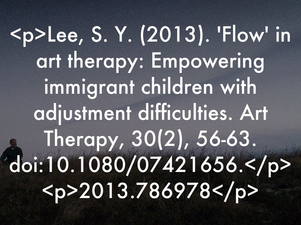 Lee, S. Y. (2013). 'Flow' in art therapy: Empowering immigrant children with adjustment difficulties. Art Therapy, 30(2), 56-63. doi:10.1080/07421656.