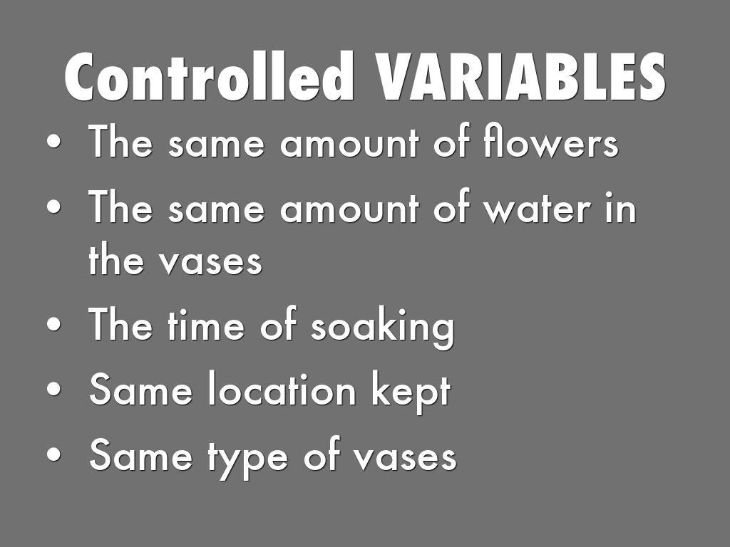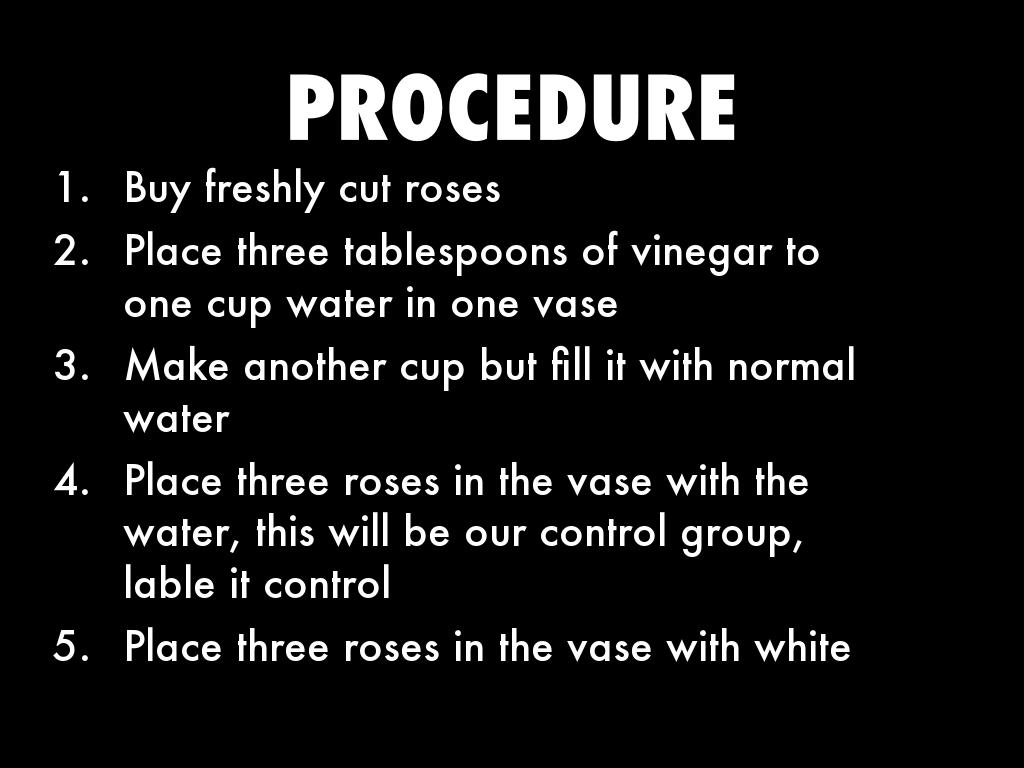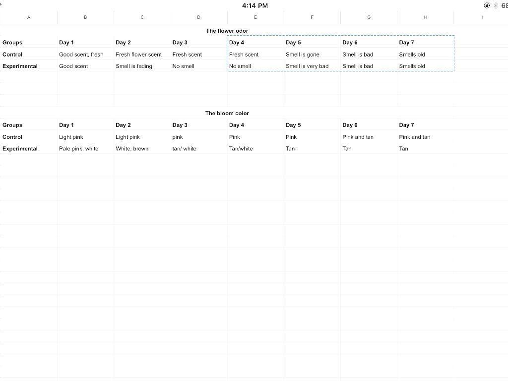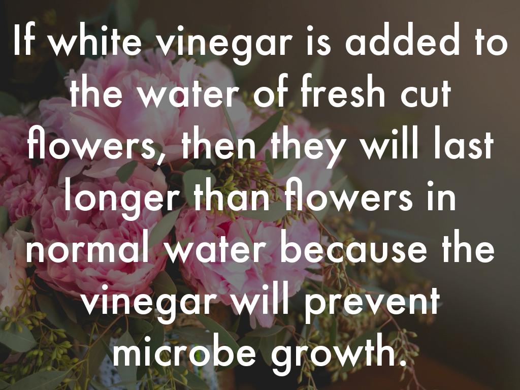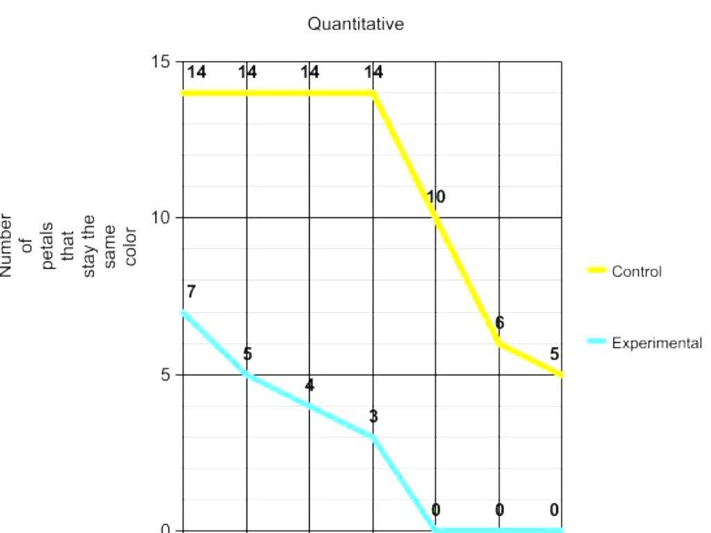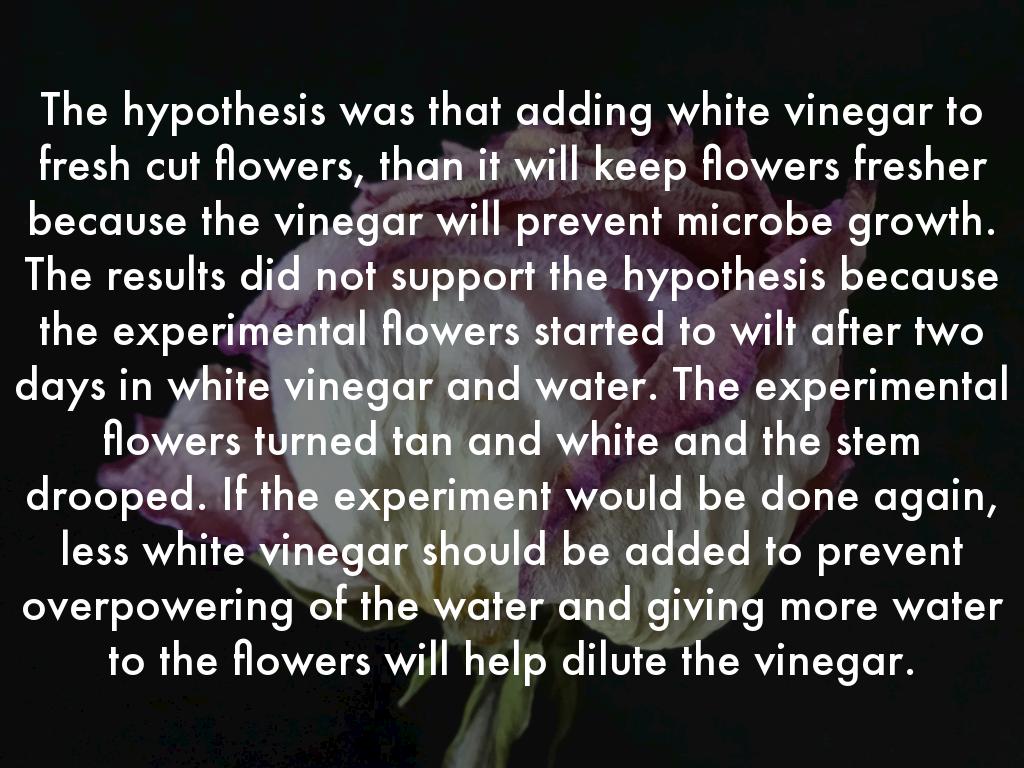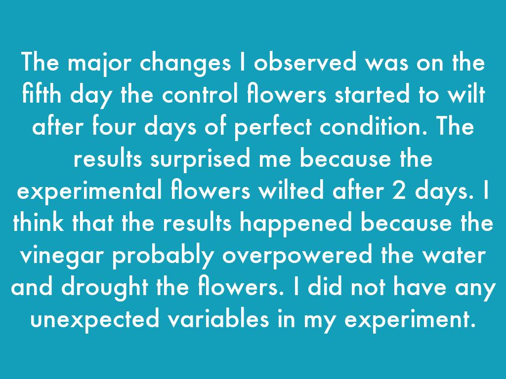 The major changes I observed was on the fifth day the control flowers started to wilt after four days of perfect condition. The results surprised me because the experimental flowers wilted after 2 days. I think that the results happened because the vinegar probably overpowered the water and drought the flowers. I did not have any unexpected variables in my experiment.