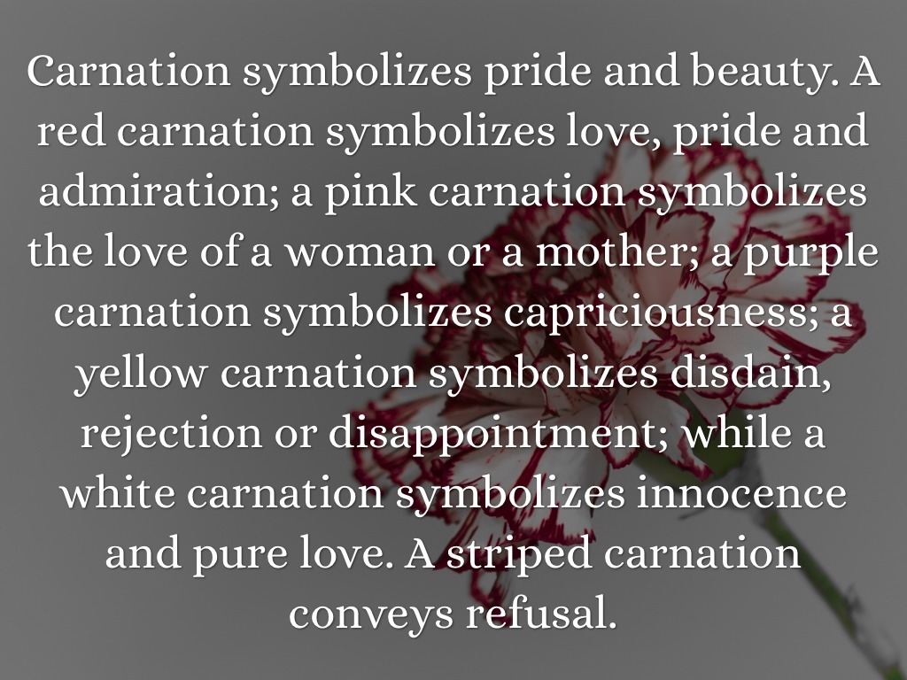 Carnation symbolizes pride and beauty. A red carnation symbolizes love, pride and admiration; a pink carnation symbolizes the love of a woman or a mother; a purple carnation symbolizes capriciousness; a yellow carnation symbolizes disdain, rejection or disappointment; while a white carnation symbolizes innocence and pure love. A striped carnation conveys refusal.