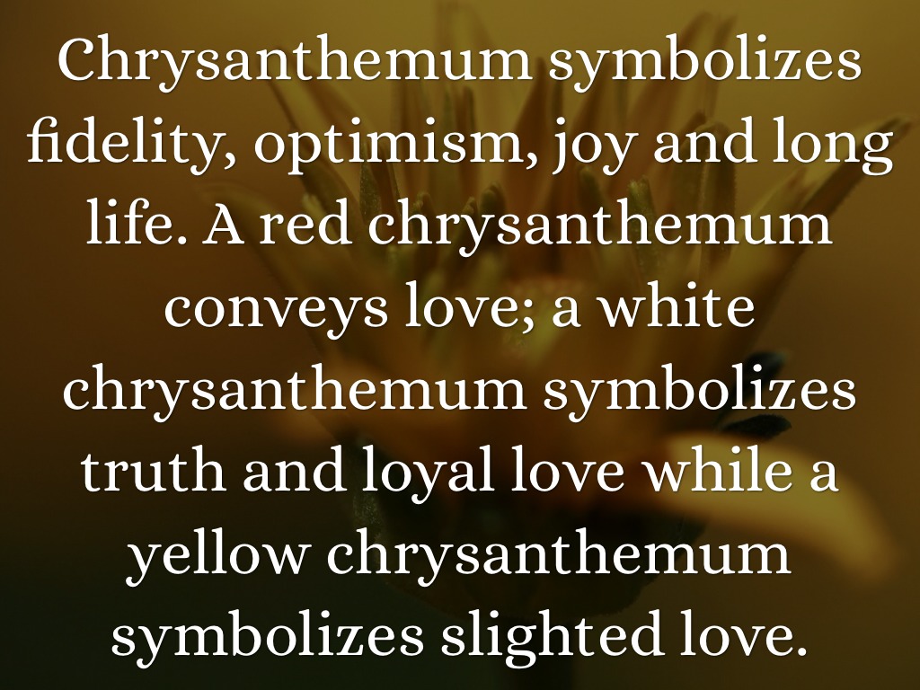 Chrysanthemum symbolizes fidelity, optimism, joy and long life. A red chrysanthemum conveys love; a white chrysanthemum symbolizes truth and loyal love while a yellow chrysanthemum symbolizes slighted love.