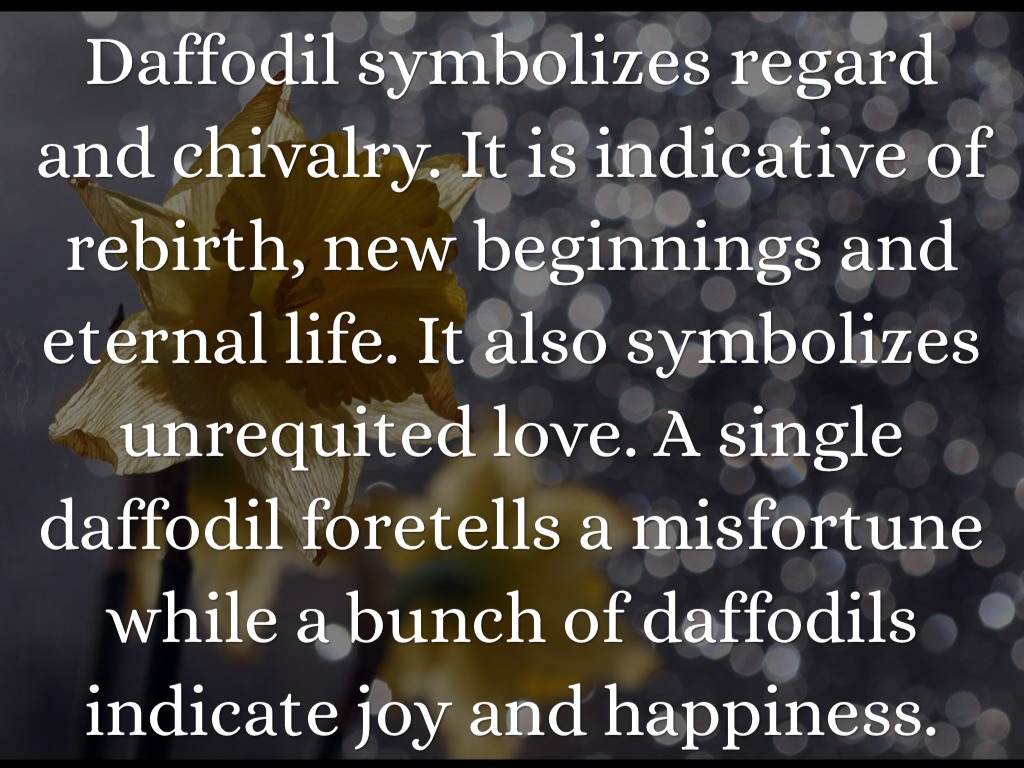 Daffodil symbolizes regard and chivalry. It is indicative of rebirth, new beginnings and eternal life. It also symbolizes unrequited love. A single daffodil foretells a misfortune while a bunch of daffodils indicate joy and happiness.