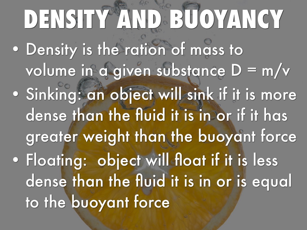 Floating: object will float if it is less dense than the fluid it is in or is equal to the buoyant force