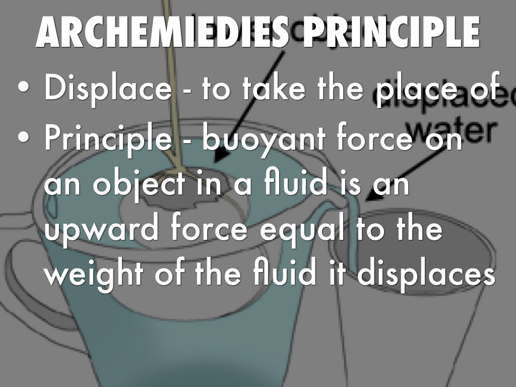 Principle - buoyant force on an object in a fluid is an upward force equal to the weight of the fluid it displaces