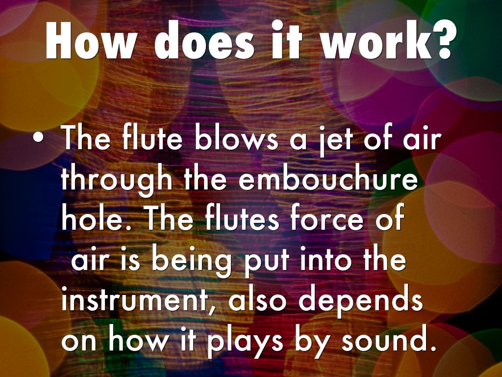 The flute blows a jet of air through the embouchure hole. The flutes force of air is being put into the instrument, also depends on how it plays by sound.
