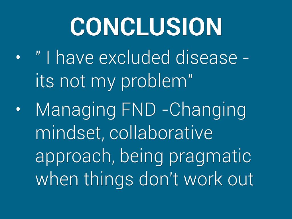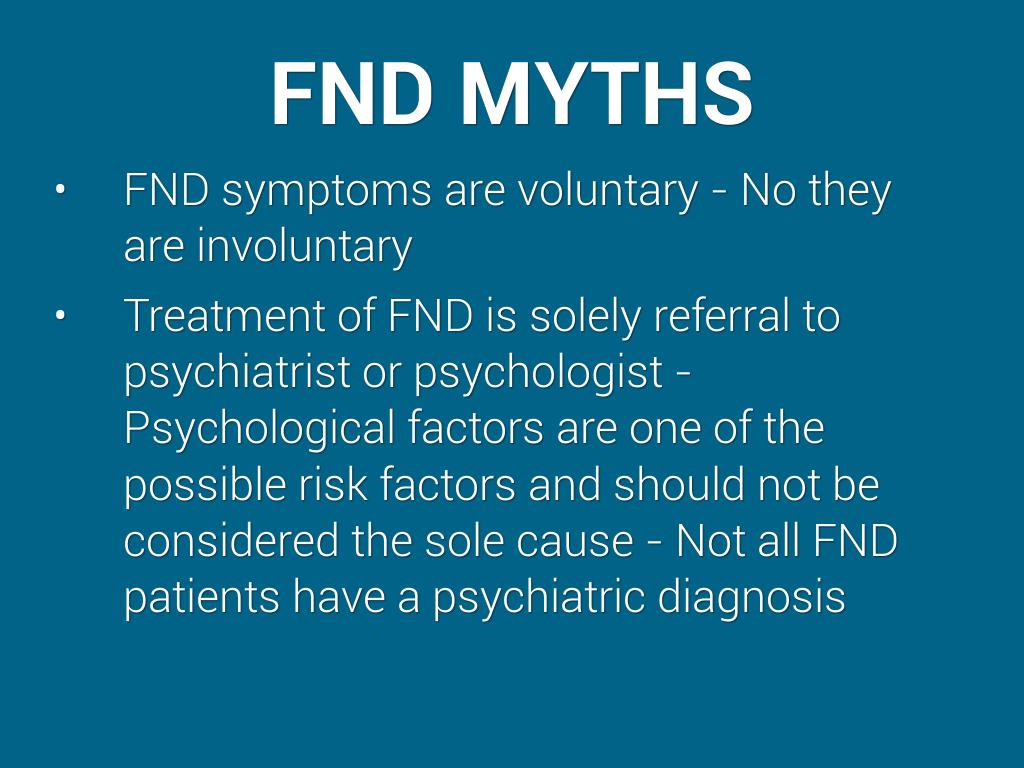 Treatment of FND is solely referral to psychiatrist or psychologist - Psychological factors are one of the possible risk factors and should not be considered the sole cause - Not all FND patients have a psychiatric diagnosis