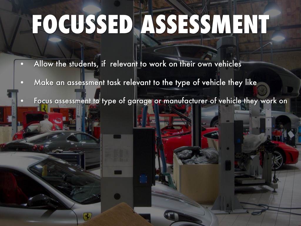 Focus assessment to type of garage or manufacturer of vehicle they work on