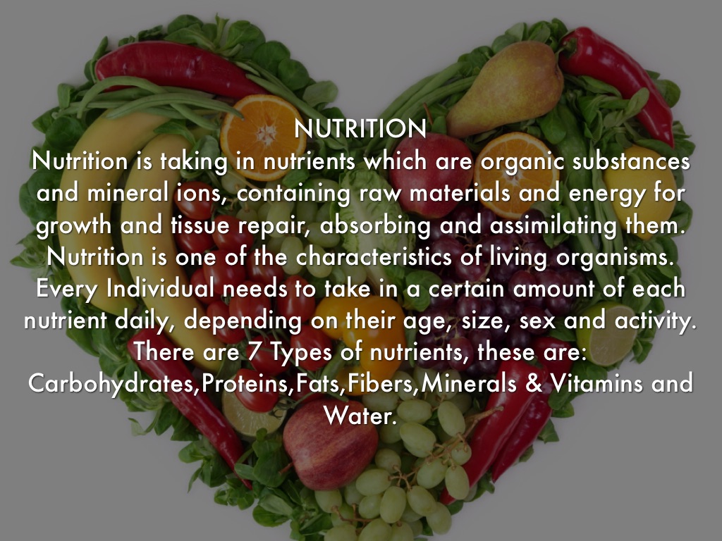 Nutrition is taking in nutrients which are organic substances and mineral ions, containing raw materials and energy for growth and tissue repair, absorbing and assimilating them. Nutrition is one of the characteristics of living organisms.