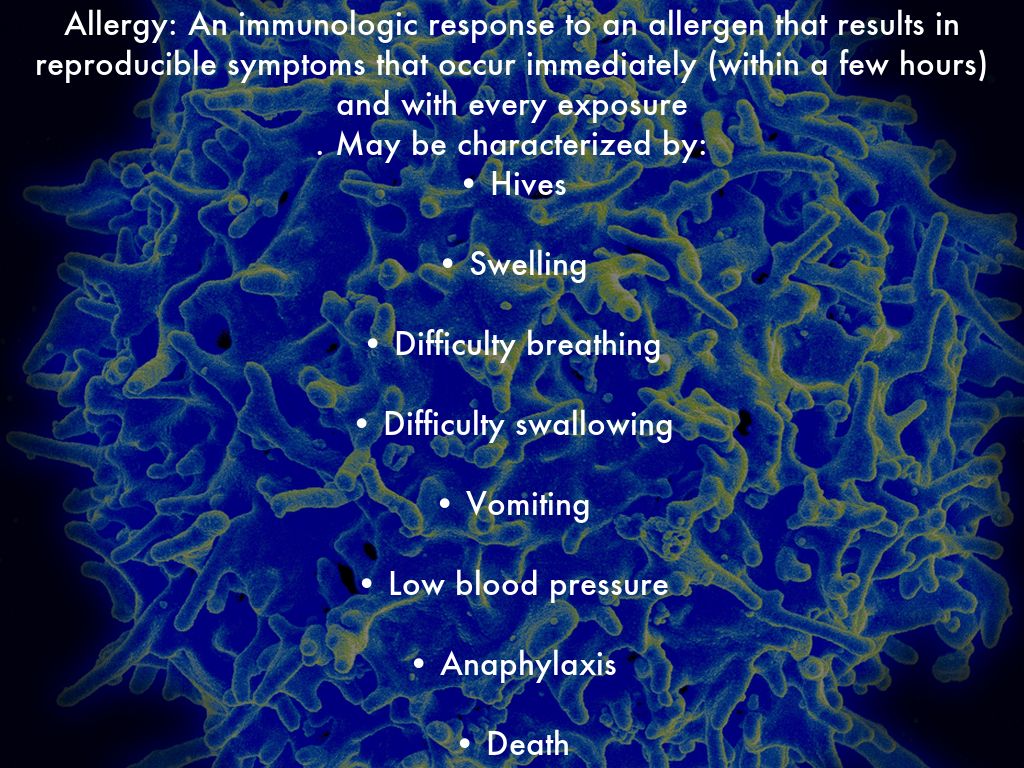 Allergy: An immunologic response to an allergen that results in reproducible symptoms that occur immediately (within a few hours) and with every exposure